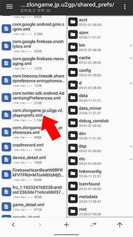2、在过完新手教程之后关闭游戏,打开MT、RE等可直接访问根目录的文件管理器,接着打开根目录下的data/data/com.zlongame.jp.u2gp/shared_prefs/com.zlongame.jp.u2gp.v2.playerprefs.xml文件,